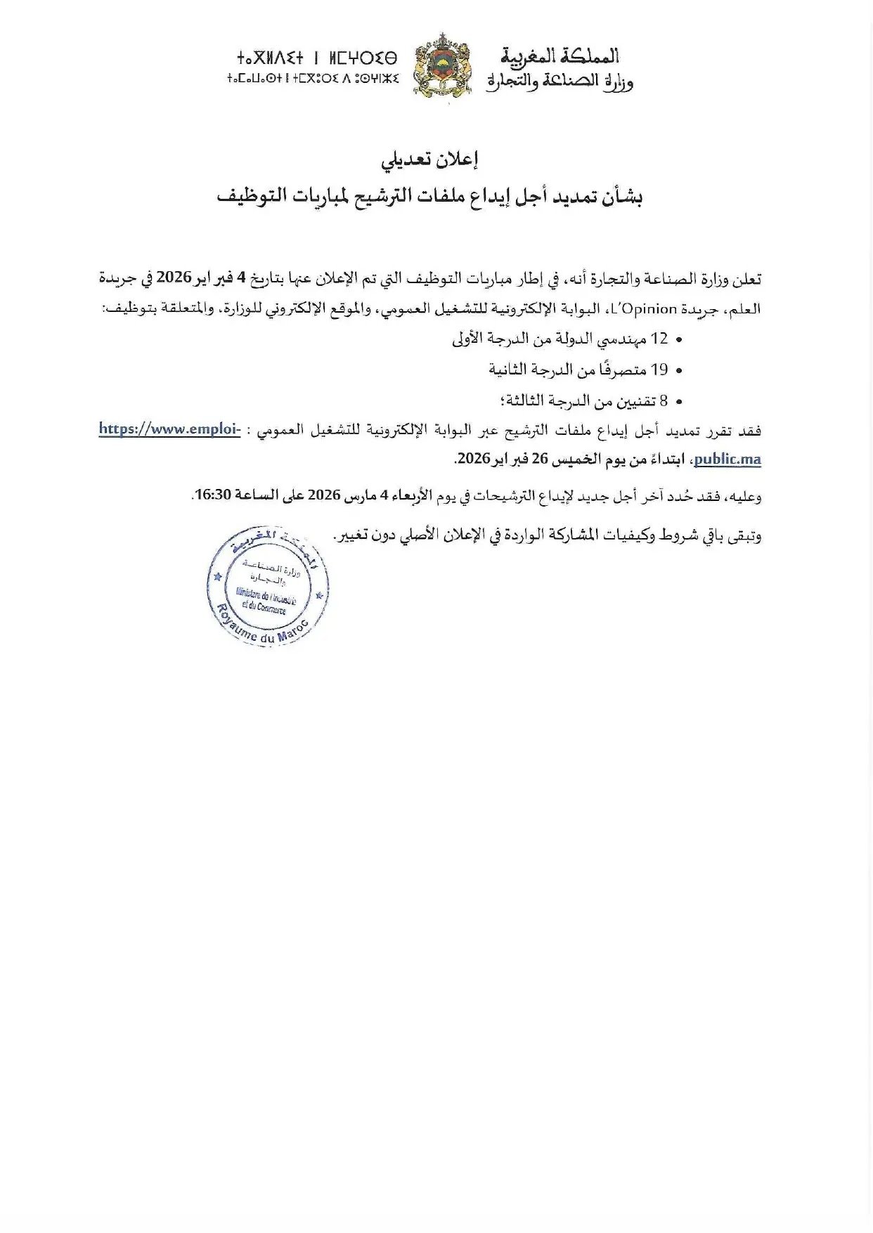 تعلن وزارة الصناعة والتجارة عن إجراء ثلاث (3) مباريات لتوظيف مهندسي الدولة من الدرجة الأولى، متصرفين من الدرجة الثانية وتقنيين من الدرجة الثالثة (39 منصباً)، وذلك يوم 29 مارس 2026، مع ضرورة إيداع الترشيحات قبل 04 مارس 2026.