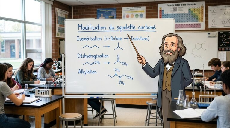 Exercices sur la modification du squelette carboné en 1ère Bac. Reconnaître les transformations de la chaîne carbonée, lire les structures...