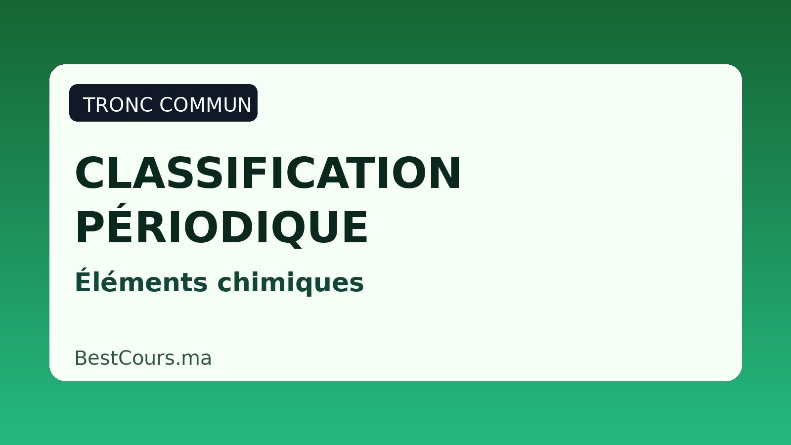 La classification périodique des éléments chimiques est un outil central en Tronc Commun. Elle aide à lire les propriétés des atomes, à comparer les éléments et à comprendre les modèles atomiques vus dans le cours, surtout le modèle de Bohr et le modèle de Lewis.
