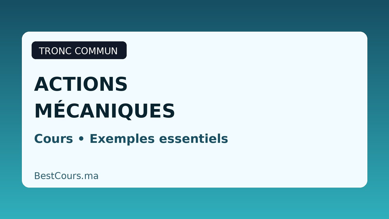 Dans ce cours, tu vas découvrir ce qu’est une action mécanique et comment on la représente par une force. Cette leçon est importante pour comprendre ensuite l’équilibre des corps et leur mouvement. Tu verras aussi comment classer les forces: contact ou à distance, localisée ou répartie, intérieure ou extérieure.